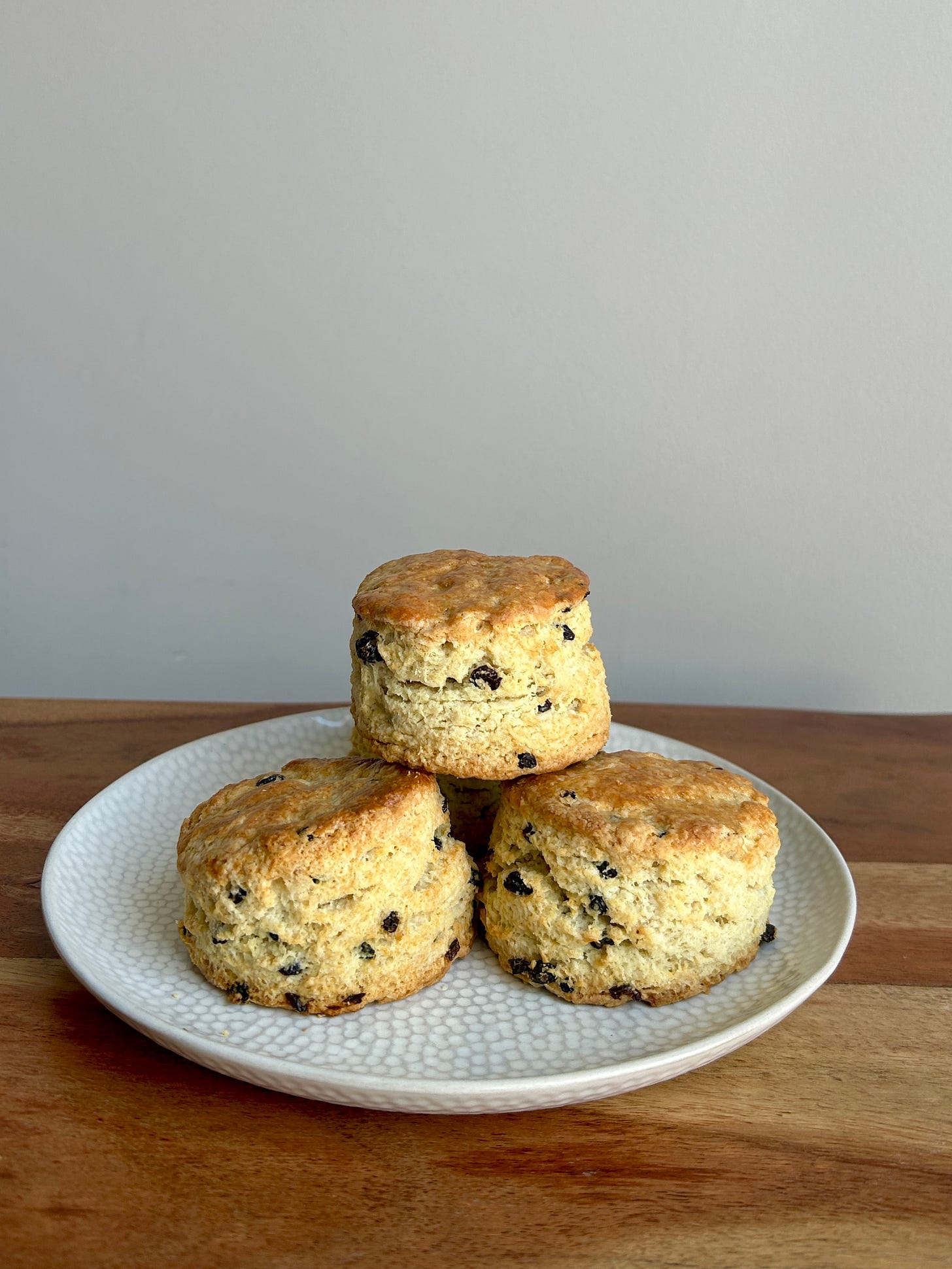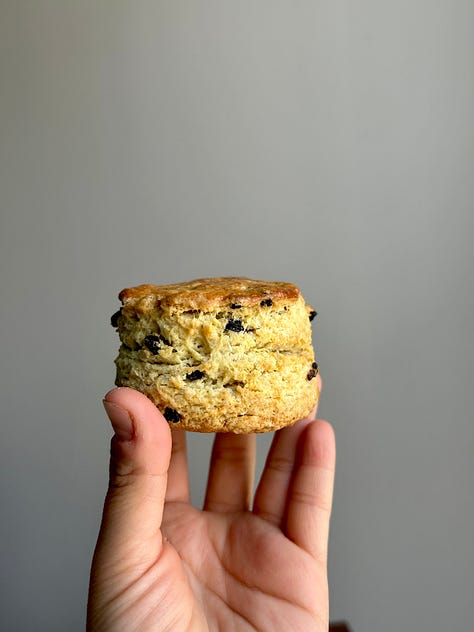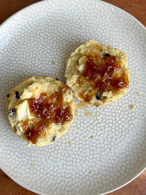 Scones tend to stir up strong opinions, especially when the biscuit versus scone conversation comes up. This is just my favourite way to make and eat a scone. I already have a couple of scone recipes on Substack, but lately I have been on a mission to get a classic currant scone just right, the kind filled with currants. I wanted one that was sturdy enough to hold butter and jam (my favourite way to eat them) but still soft and tender on the inside. I’ve used sour cream in this recipe because I really enjoy the richness it adds, but swapping it for buttermilk works beautifully too — I do this quite often because I love the flavour of buttermilk. One thing I have learned is that the dough needs a little more handling than you might expect. Not kneaded like bread, but just enough so everything comes together and there are no dry bits of flour left. The end result is a scone that’s soft, flavourful, and made for enjoying straight from the oven with whatever topping you love most
