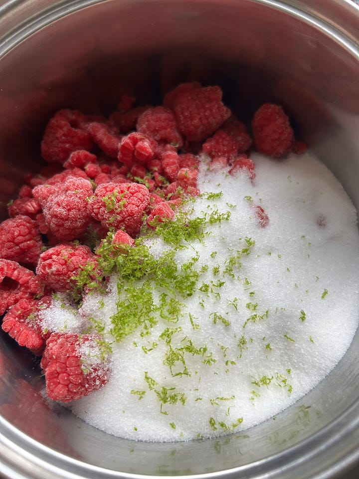 Add raspberries to a large pan. Add lime zest and juice, then the sugar. Stir to combine.