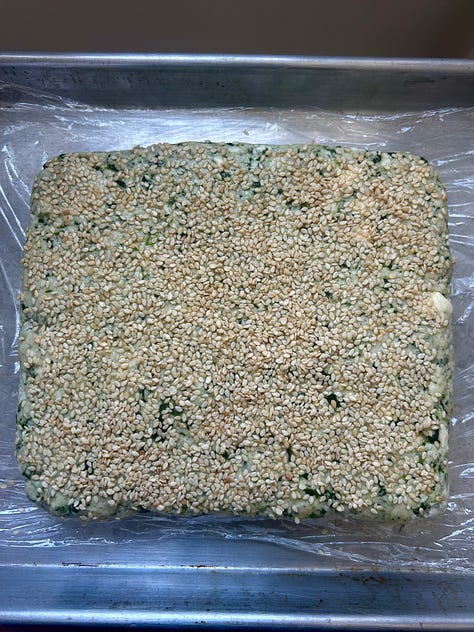 When you're ready to bake, unwrap the chilled dough and turn the rectangle onto a cutting board sesame-side down. This makes it easier to get clean, sharp cuts without dragging the sesame seeds through the dough keeping the edges neat and the seeds firmly in place. For mini scones like I did, cut into 12 equal squares. For larger, more regualr sized scones cut them into 6 equal squares.